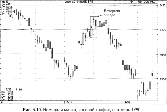 На рисунке 5.10 можно видеть, что за последний час торгов 5 сентября и первые два часа торгов следующей сессии сформировалась вечерняя звезда, которая при этом не является островной вершиной. Следовательно, сигнал разворота в данном случае можно было заметить только благодаря свечному анализу. Обратите также внимание на то, что подъем, завершившийся этой вечерней звездой, начался 4 сентября с появления утренней звезды.
