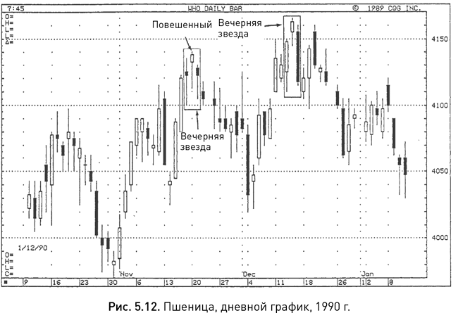 На рисунке 5.12 вы можете видеть две вечерних звезды. Та, что сложилась в середине декабря, имеет классический вид: открывает ее свеча с длинным белым телом, а закрывает – свеча с вытянутым черным телом. В отличие от нее вечерняя звезда в середине ноября выглядит необычно, поскольку ее первая и третьи свечи не имеют длинных тел, к тому же первое тело не является белым. И все-таки есть основания считать ее моделью разворота на вершине – не только потому, что внешне она немного напоминает вечернюю звезду, но и потому, что в нее входит медвежья свеча «повешенный» от 21 ноября. Открытие торгов на следующий день ниже тела повешенного подтвердило, что подъем цен подошел к концу.