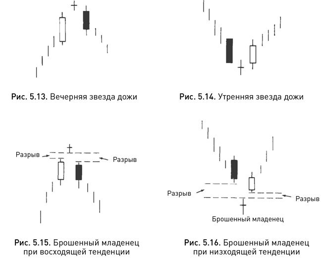 Если на растущем рынке свеча типа «дожи» образуется с гэпом вверх по отношению к телу предыдущей свечи или на падающем рынке – с гэпом вниз, то ее называют звездой дожи. Ее появление свидетельствует о том, что предыдущая тенденция может измениться, однако для подтверждения этого сигнала разворота нужно дождаться еще одной свечи. На растущем рынке у этой третьей свечи должно быть длинное черное тело, перекрывающее значительную часть белого тела первой свечи. Такая модель называется вечерняя звезда дожи (evening doji star, см. рис. 5.13) и является разновидностью модели «вечерняя звезда». Различие между ними в том, что у первой модели в центре находится свеча типа «дожи», а у второй – обычная свеча с маленьким телом. Вечерняя звезда дожи является более сильным сигналом.