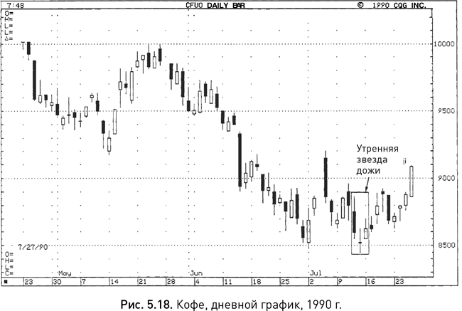 На рисунке 5.17 появление звезды дожи в начале июня остановило наблюдавшееся до этого снижение (напомним, что свеча считается звездой, даже когда ее тень перекрывает часть тела предыдущей свечи, как в данном примере). Следующая белая свеча подтвердила смену тренда и завершила формирование модели «утренняя звезда дожи».