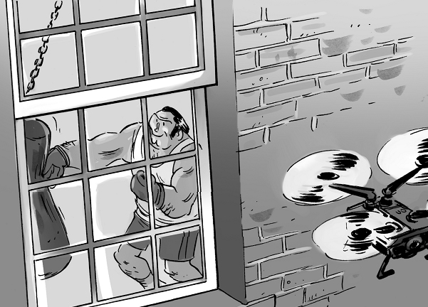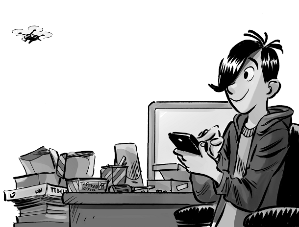 Ларри перевёл взгляд на стеллаж, где среди журналов, пустых чашек, магнитных отвёрток и контейнеров из-под тайской еды, которой юноша подкреплял свои силы в часы ночной работы, красовался некий квадратный предмет. Размером он был не больше спичечного коробка, и во всех его четырёх углах были установлены крошечные пропеллеры. Ларри не сомневался: случайный прохожий никогда бы не догадался, что перед ним одно из последних достижений техники.