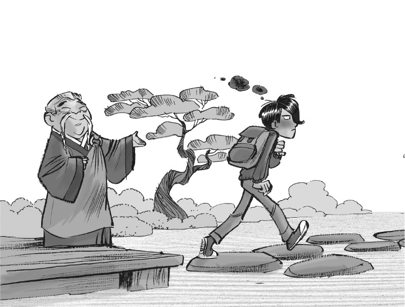 Пока Миядзаки-сэнсэй ждал его под навесом, скрестив руки на груди, Ларри достал из рюкзака белое кимоно, неторопливо надел его, разулся и босиком подошёл к большому камню в центре сада.