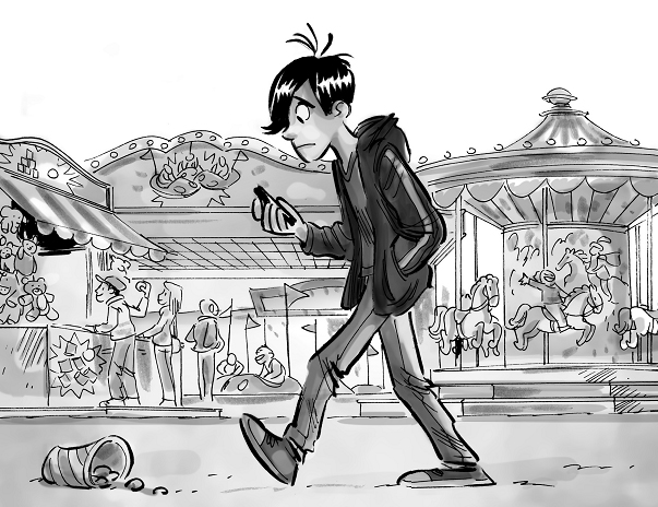 Темноволосый и тощий, без единого намёка на мускулы, четырнадцатилетний юноша слонялся туда-сюда между каруселью с лошадками и каруселью с цепочками. Ларри то и дело с тоской поглядывал на экран «ИнтерОко» – супермощного технологического устройства, которое ему выдали как агенту школы для сыщиков.