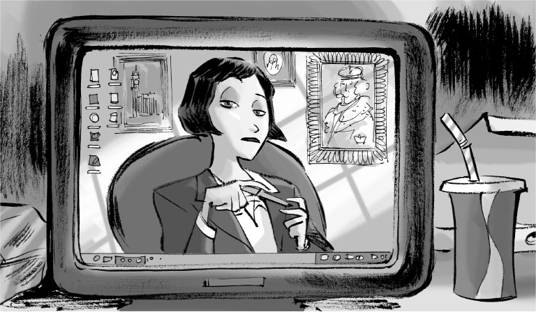 Время от времени он что-то бормотал себе под нос и делал заметки. Вот он прищурился, глядя на персонажей чёрно-белого фильма пятидесятых годов.