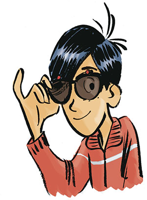 В самом деле, юный детектив снял с себя куртку, перчатки и шапку-шлем, однако на носу его по-прежнему красовались тёмные очки с красными огоньками на оправе.