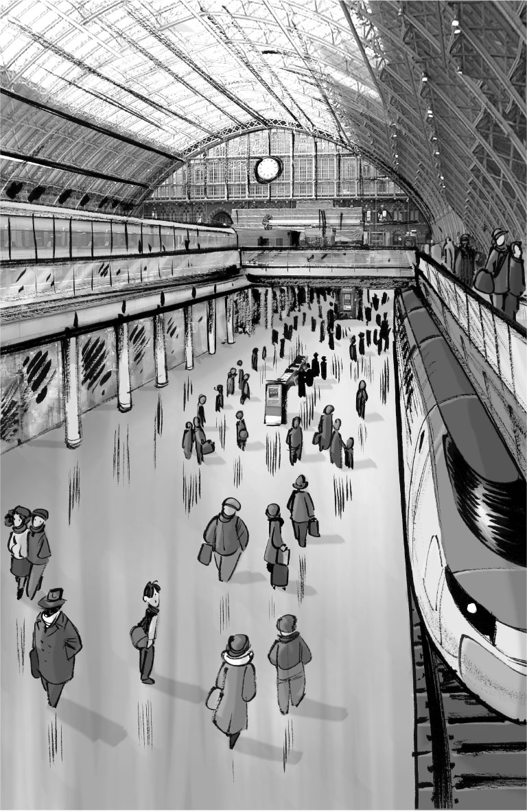 Поглощённый своими мыслями, Ларри прибыл на Сен-Панкрас очень рано, его поезд отправлялся только в половине десятого утра. Войдя в вестибюль, он замер как вкопанный: колоссальные металлические арки, зеркальные полы и сверкающие составы на путях делали вокзал похожим на космодром далёкого будущего.