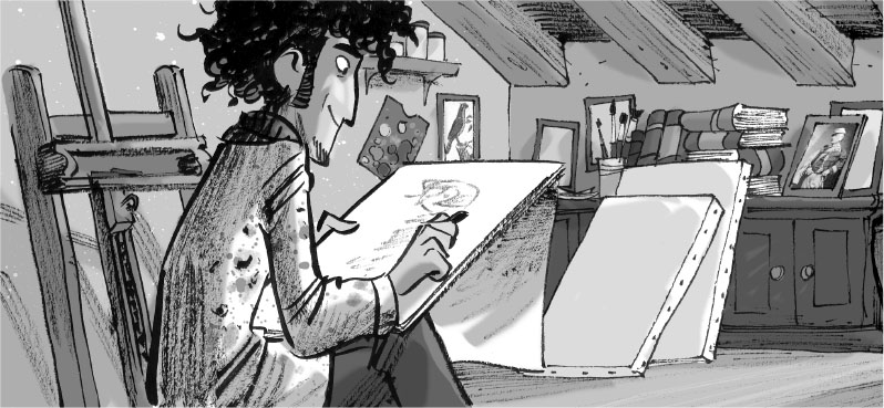 Он передал картину Агате, и та хихикнула, увидев своего незадачливого кузена: взъерошенные волосы, пухлые щёки и сердитый взгляд. Забавляясь, вместо ног Гаспар нарисовал ему цыплячьи лапки.