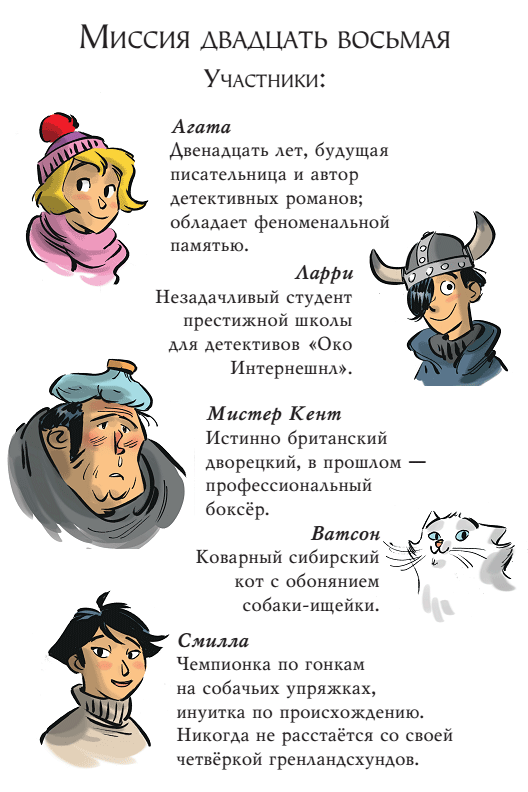 В будущем Агата мечтала стать писательницей в жанре детективного романа, а пока тренировалась распутывать загадки, самоотверженно помогая брату-сыщику. Невероятные дедуктивные способности и феноменальная память позволяли девочке раскрывать сложные криминальные дела, которые «Око Интернешнл» поручало её двоюродному брату Ларри. К тому же юноша, похоже, ничего не знает ни о викингах, ни о вечных льдах, так что без поддержки он там точно пропадёт.