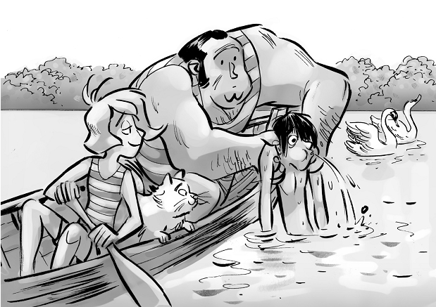Не успела она разобраться, что привлекло внимание кота, как вдруг послышался крик, а за ним – шумный всплеск. И в самом деле: неподалёку от них какой-то горе-ныряльщик молотил руками по воде, стараясь удержаться на поверхности. Пенные брызги разлетались во все стороны.