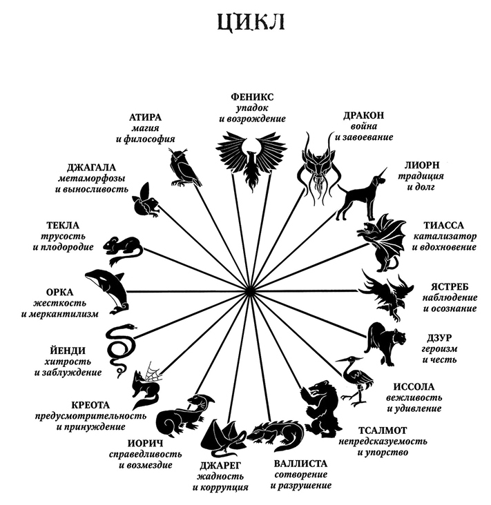Цикл: дракон, дзур и креота; атира, ястреб и феникс; текла и джарег.