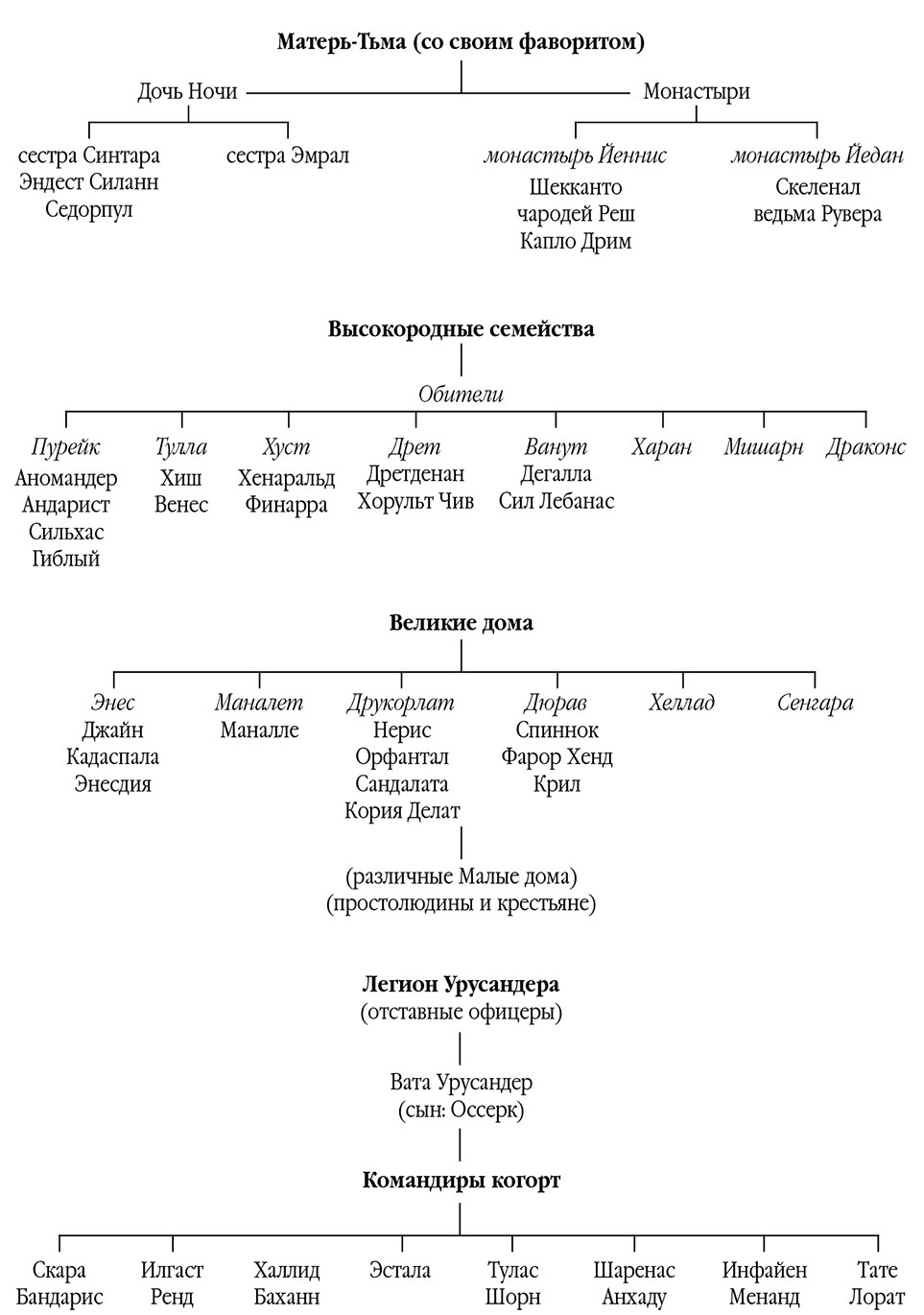 «Аномандарис». Смелое название. Но помни, что я не всегда был слепым. Это история не одного только Аномандера. Она не поместится в маленькую шкатулку. Возможно даже, что сам Аномандер играет здесь наименее значительную роль. Тот, кого подталкивает в спину множество рук, будет двигаться лишь в одном направлении помимо своего желания.