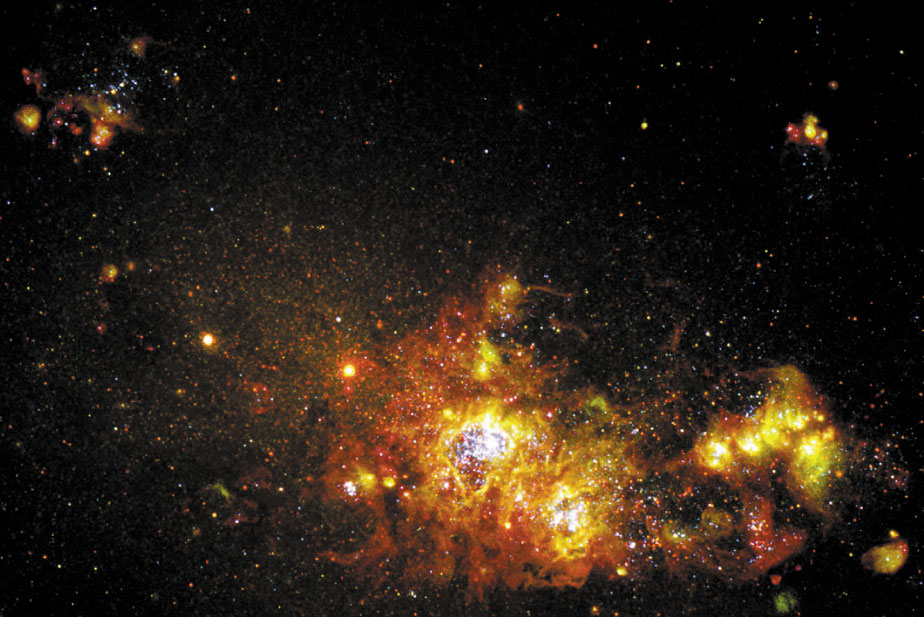 В галактике NGC 4214, находящейся на расстоянии около 13 млн световых лет от Земли, идет процесс образования скоплений новых звезд из межзвездного газа и пыли. На этом снимке, полученном на телескопе «Хаббл», мы видим этапы образования и эволюции звезд и звездных скоплений. Самые молодые из этих звездных скоплений расположены в правом нижнем углу снимка, где они выглядят, как несколько ярких сгустков светящегося газа.