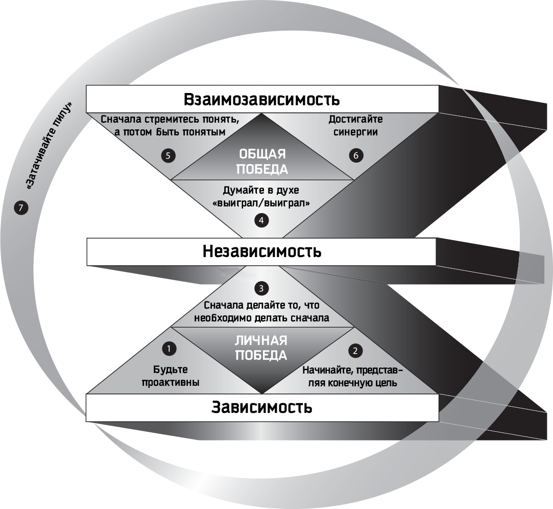 Единственное, что мы можем контролировать непосредственно– это наше собственное поведение. Поведение других людей мы можем контролировать лишь косвенно, опираясь на доступные нам методы влияния. Существует множество вещей, над которыми мы не властны– погода, экономика, родственники со стороны нашей второй половины, наши гены. Во всех случаях (прямой контроль, косвенный контроль, отсутствие контроля) подход один и тот же– надо начинать менять себя, свои навыки, методы влияния или свое отношение. Семейная пара из этой истории удивительным образом изменила окружающие их обстоятельства, и это сделало жизнь супругов более гармоничной, спокойной, счастливой и в личном, и в семейном плане. Они изменили методы влияния друг на друга, используя навык 5: cначала стремитесь понять, потом– быть понятыми. Они изменили метод влияния в отношениях с начальником мужа, проявляя отважное стремление быть понятыми (вторая часть навыка 5) и достигая синергетического соглашения в духе общей победы (навыки 4 и 6: думайте в духе «выиграл/выиграл» и достигайте синергии). Поразительно, какую свободу обретают люди, принимая на себя ответственность и инициативу.