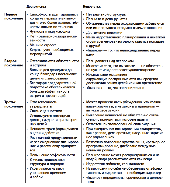 Достоинства и недостатки трех поколений управления временем представлены в таблице.