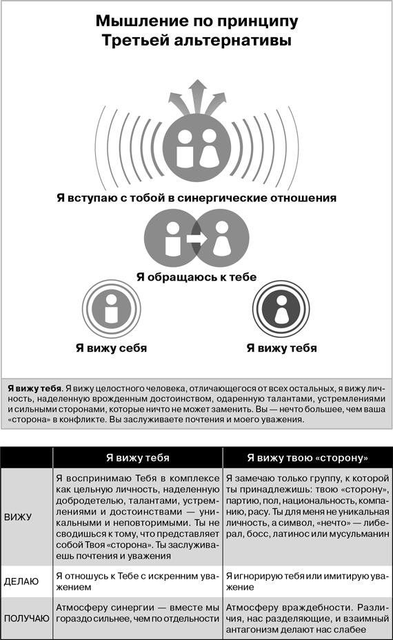По сути, парадигма «я вижу тебя» связана с характером – с любовью к людям, великодушием, терпимостью и искренним вниманием к другому человеку. Если бы я придерживался парадигмы «я воспринимаю тебя стереотипно», то нельзя было бы поручиться, что я так же близко к сердцу принимаю чужие интересы, как и свои, а обретение Третьей альтернативы стало бы и вовсе невозможно. Глядя на вас, я видел бы лишь представителя другой стороны. Возможно, я держался бы с вами вежливо, но это было бы показное, фальшивое уважение.