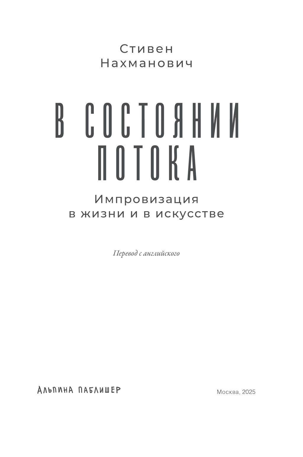 Следовательно, «В состоянии потока» – это дорога, которая начинается с исследования источников творчества и размышлений автора о вдохновении, находящем выражение во времени. Далее он вводит нас в суть деятельности как таковой: показывает, как можно включиться в практику, которая сама по себе является целью, и предлагает способы превращения практики в игру. В третьем разделе автор ведет нас сквозь неизбежные преграды и препятствия, необходимые и важные пункты на пути, позволяющие нам в итоге пожинать плоды своих усилий. В заключительных главах, посвященных результатам трудов, Нахманович предлагает нам спросить себя, что значит подходить к жизни в целом как к творческой практике, открыто и с неограниченным рвением. Затем он идет дальше и расширяет дорогу, рассматривая, что именно в первую очередь заставляет нас, отдельных личностей, обращаться к творчеству. «За рамками стремления творить, – утверждает автор, – все же есть более глубокий уровень вовлеченности, состояние единения с целым за пределами нас самих».
