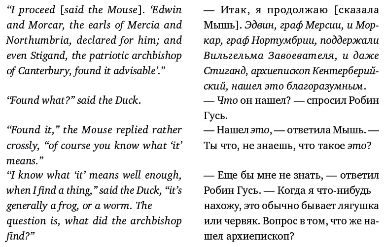 Вы можете возразить, что эксперимент не показывает, что детский мозг способен определить подлежащее в предложении. Возможно, дети руководствовались просто значением слов. The man who is running 'Человек, который бежит' указывает на одно действующее лицо, играющее определенную роль в ситуации, и дети могли просто отслеживать, какие слова в предложении относятся к действующим лицам, а не то, какие слова входят в группу подлежащего. Крейн и Накаяма предвидели это возражение. В списке команд, которые они давали детям, были команды вроде Ask Jabba if it is raining in this picture 'Спроси Джаббу, идет ли на картинке дождь'. В английском языке в данном предложении имеется формальное подлежащее it, которое, конечно, не указывает ни на что на картинке; оно является «пустым» элементом и используется в предложении только потому, что правила синтаксиса английского языка требуют наличия подлежащего. Однако при образовании вопросов в английском языке оно ведет себя точно так же, как и другие подлежащие: Is it raining? Как же дети справляются с такими «словами-заменителями», не имеющими значения? Возможно, они мыслят так же буквально, как Робин Гусь в «Приключениях Алисы в Стране чудес»[9].