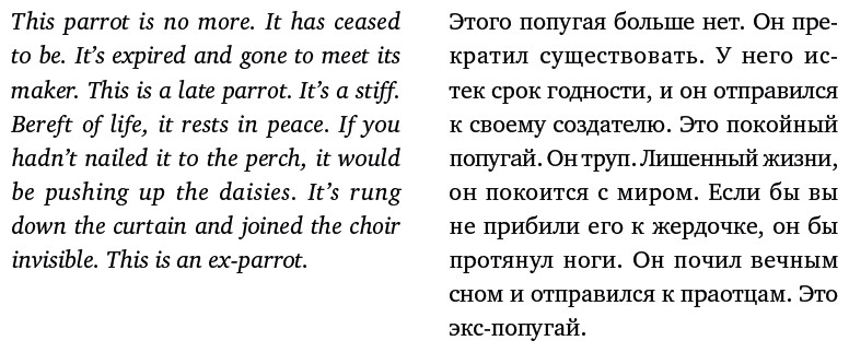 Дискуссии, предполагающие, что язык определяет мышление, продолжаются только потому, что в обществе недоверие к этой идее подавляется. Бертран Рассел замечает: «Пусть собака и не может сказать, что ее родители были честными, но бедными, – но можно ли сделать из этого вывод, что собака не обладает сознанием?» (Она разве в отключке? Или она зомби?) Одна аспирантка однажды поспорила со мной, применяя очаровательно вывернутую наизнанку логику: язык должен влиять на наше мышление, поскольку если бы он не влиял, то у нас не было бы причин бороться с сексизмом в речи (очевидно, тот факт, что сексизм может быть оскорбителен, не является достаточной причиной). Что касается правительственных эвфемизмов, то их использование заслуживает презрения не потому, что они помогают контролировать наше сознание, а потому, что они позволяют лгать. Оруэлл довольно точно описал это в своем бессмертном эссе. Формулировка «увеличение государственного дохода» гораздо шире, чем понятие «налоги», и слушатели, естественно, полагают, что если бы политик говорил о налогах, то он бы так и сказал. Как только эвфемизм становится очевидным, люди уже не настолько запутаны, чтобы поддаться на этот обман. «Национальный совет преподавателей английского языка» ежегодно выпускает пресс-релиз, в котором высмеивает правительственные обороты речи, которые могут вводить нас в заблуждение, а намеренное акцентирование внимания на эвфемизмах – это популярный юмористический жанр. Обратите внимание, например, на речь разгневанного посетителя зоомагазина в «Летающем цирке Монти Пайтона»: