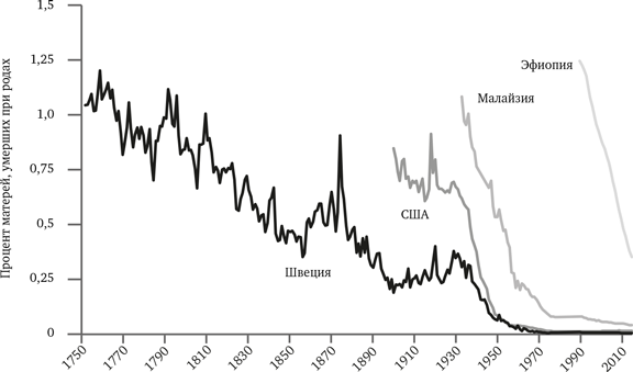 С конца XVIII века уровень такой смертности в Европе снизился в триста раз, с 1,2 % до 0,004 %. Этот спад распространился и на другие части света, в том числе и на самые бедные страны, где уровень материнской смертности снижался еще стремительней, но из-за позднего старта на протяжении более короткого времени. Для всего мира этот показатель, упав за последние 25 лет почти в два раза, теперь равен 0,2 % – примерно как в Швеции в 1941 году[138].