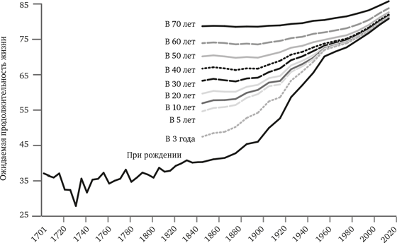 Так действительно ли те из нас, кто пережил испытания младенчества и детства, живут дольше, чем те, кому удавалось то же самое в предшествующие эпохи? Да, гораздо дольше. Рис. 5–4 показывает ожидаемую продолжительность жизни британца при рождении и в разных возрастах от 1 года до 70 лет на протяжении последних трех веков.