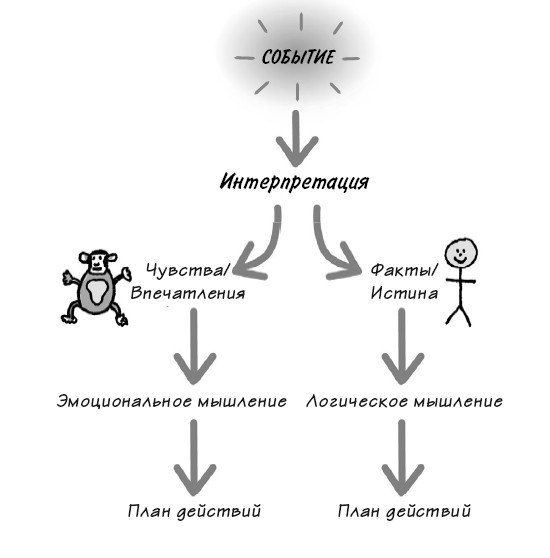 Джон и его Шимпанзе оба услышали этот ответ, но у них появились различные интерпретации замечания Полин и реакции на него. Человек в Джоне, будучи разумным, может думать: «На самом деле я не придавал этому такого уж большого значения, но очевидно, что Полин не хочет меня слушать, поэтому я не стану продолжать» или: «Все уладилось, и она, вероятно, права. Мне следует выбросить это из головы и не реагировать». Человек остается спокойным и без проблем уже переключился на другую тему.