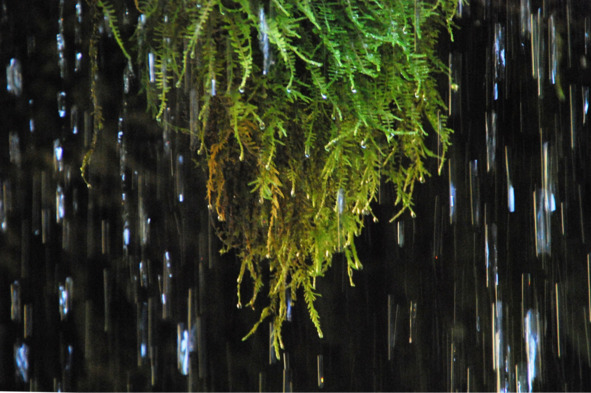 В определенное время дня, освещение создает радугу пересветов солнечных лучей на каплях воды, стекающих по мху. Лучи освещают стекающие струи так, что все вокруг начинает играть разноцветными отблесками.