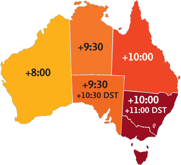 Australian time zones are shown on this map. There are three: Australian Western Standard Time (AWST); Australian Central Standard Time (ACST); and Australian Eastern Standard Time (AEST). Some individual states (Western Australia, Northern Territory and Queensland) do not use daylight saving time (DST) during the summer months. To obtain local (zone) time from Universal Time (UT), add the hours shown in this table. If the result is greater than 24, subtract 24 hours. If the initial or subsequent result is less than 12:00, the zone time is a.m.; if greater, subtract 12 hours to get the time p.m. The dates when Daylight Saving Time begins and ends are shown on the individual calendars inside the book. At the time of writing, it is introduced on the first Sunday of October and ends on the first Sunday in April.