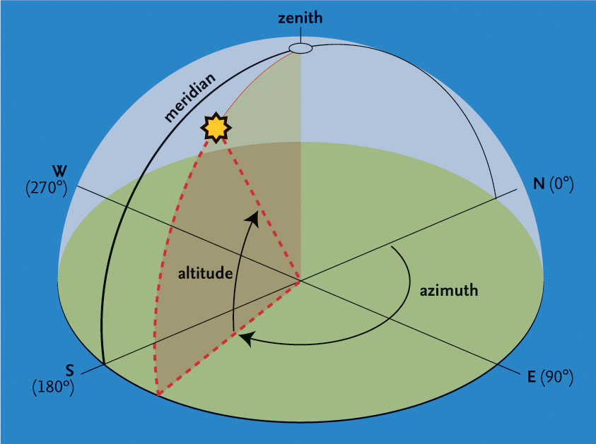 It is useful to know some of the special terms for various parts of the sky. As seen by an observer, half of the celestial sphere is invisible, below the horizon. The point directly overhead is known as the zenith, and the (invisible) one below one’s feet as the nadir. The line running from the north point on the horizon, up through the zenith and then down to the south point is the meridian. This is an important invisible line in the sky, because objects are highest in the sky, and thus easiest to see, when they cross the meridian. Objects are said to transit, when they cross this line in the sky.