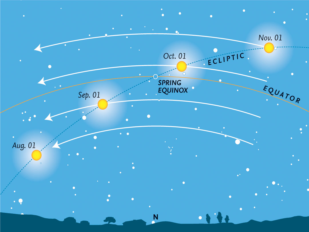Another important line on the celestial sphere is the Sun’s apparent path against the background stars – in reality the result of the Earth’s orbit around the Sun. This is known as the ecliptic. The point where the Sun, apparently moving along the ecliptic, crosses the celestial equator from south to north is known as the (southern) autumn equinox, which occurs on March 20 or 21. At this time and at the (southern) spring equinox, on September 22 or 23, when the Sun crosses the celestial equator from north to south, day and night are almost exactly equal in length. (There is a slight difference, but that need not concern us here.) The March equinox is currently located in the constellation of Pisces, and is important in astronomy because it defines the zero point for a system of celestial coordinates, which is, however, not used in this Guide.