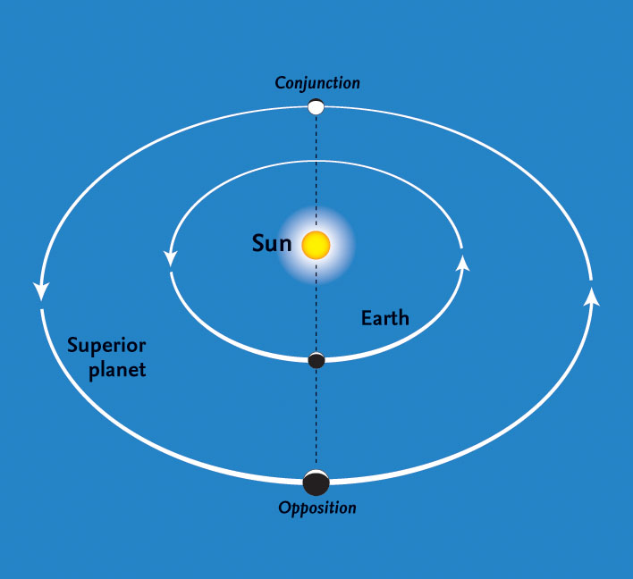 The term conjunction is also used when a planet is either directly behind or in front of the Sun, as seen from Earth. (Under normal circumstances it will then be invisible.) The conditions of most favourable visibility depend on whether the planet is one of the two known as inferior planets (Mercury and Venus) or one of the three superior planets (Mars, Jupiter and Saturn) that are covered in detail. (Some details of the fainter superior planets, Uranus and Neptune, are included in this Guide, and special charts for both are given here.)