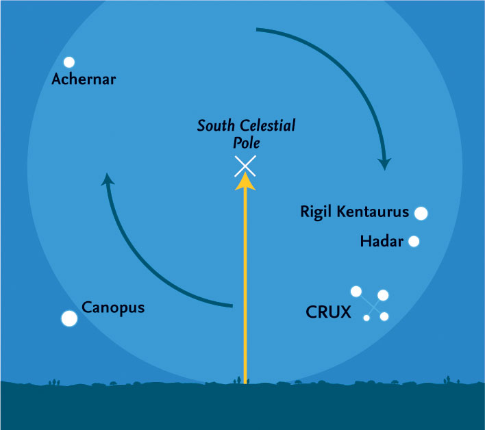 The celestial sphere appears to rotate about an invisible axis, running between the North and South Celestial Poles. The location (i.e., the altitude) of the Celestial Poles depends entirely on the observer’s position on Earth or, more specifically, their latitude. The charts in this book are produced for the latitude of 35°S, so the South Celestial Pole (SCP) is 35° above the southern horizon. The fact that the SCP is fixed relative to the horizon means that all the stars within 35° of the Pole are always above the horizon and may, therefore, always be seen at night, regardless of the time of year. The southern circumpolar region is an ideal place to begin learning the sky, and ways to identify the circumpolar stars and constellations will be described shortly.