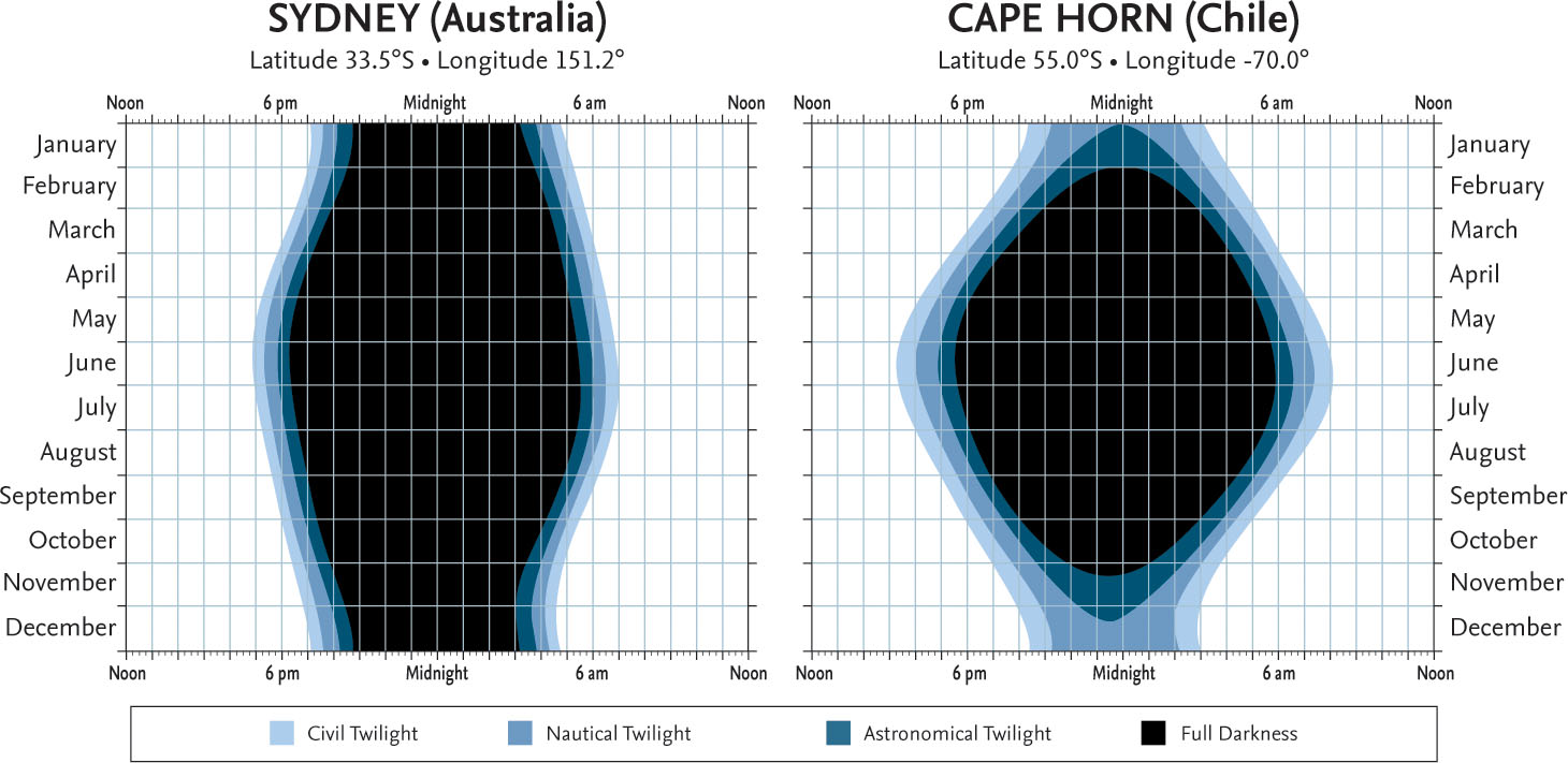 The conditions for observing naturally vary over the course of the year. During the summer, twilight may persist throughout the night and make it difficult to see the faintest stars. There are three recognized stages of twilight: civil twilight, when the Sun is less than 6° below the horizon; nautical twilight, when the Sun is between 6° and 12° below the horizon; and astronomical twilight, when the Sun is between 12° and 18° below the horizon. Full darkness occurs only when the Sun is more than 18° below the horizon. During nautical twilight, only the very brightest (navigation) stars are visible. During astronomical twilight, the faintest stars visible to the naked eye may be seen directly overhead, but are lost at lower altitudes. At Sydney, full darkness persists for about six hours at mid-summer. Even at Christchurch, NZ (not shown), full darkness lasts about four hours. By contrast, as far south as Cape Horn, at mid-summer nautical twilight persists, so only the very brightest stars are visible.