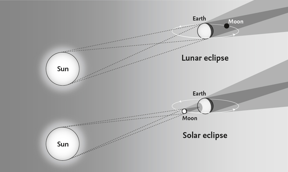 When the Moon passes through the Earth’s shadow (top), a lunar eclipse occurs. When it passes in front of the Sun (below) a solar eclipse occurs.