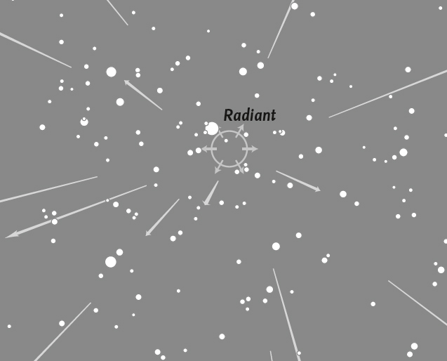 At some time or other, nearly everyone has seen a meteor – a ‘shooting star’ – as it flashed across the sky. The particles that cause meteors – known technically as ‘meteoroids’ – range in size from that of grain of sand (or even smaller) to the size of a pea. On any night of the year there are occasional meteors, known as sporadics, that may travel in any direction. These occur at a rate that is normally between 3 and 8 in an hour. Far more important, however, are meteor showers, which occur at fixed periods of the year, when the Earth encounters a trail of particles left behind by a comet or, very occasionally, by a minor planet (asteroid). Meteors always appear to diverge from a single point on the sky, known as the radiant, and the radiants of major showers are shown on the charts.