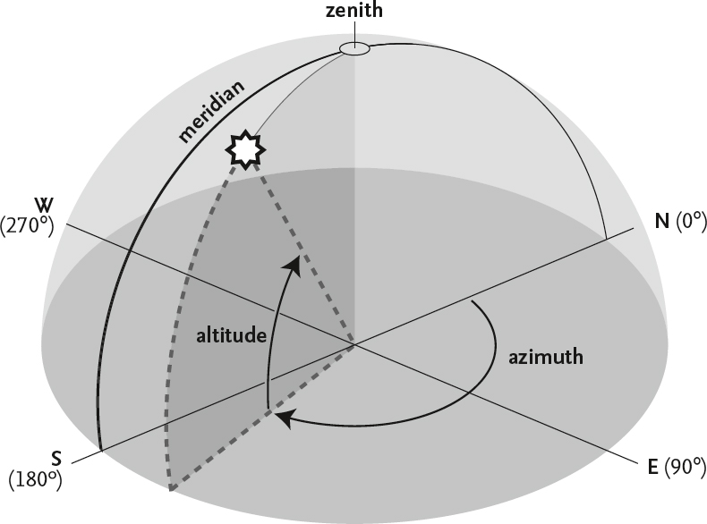In this book, reference is sometimes made in the text and in the diagrams to the standard compass points around the horizon. The position of any object in the sky may be described by its altitude (measured in degrees above the horizon) and its azimuth (measured in degrees from north, 0°, through east, 90°, south, 180°, and west, 270°). Experienced amateurs and professional astronomers also use another system of specifying locations on the celestial sphere, but that need not concern us here, where the simpler method will suffice.