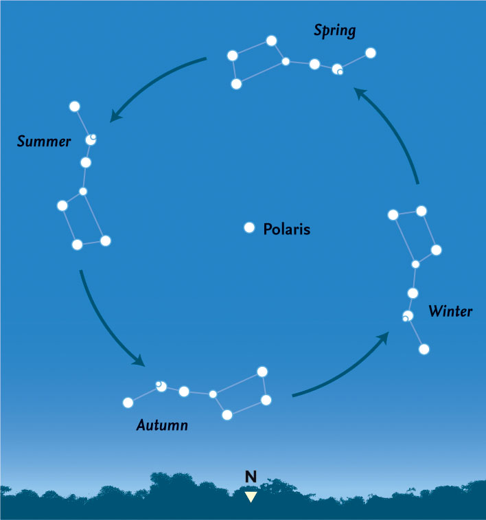 Because of the movement of the stars caused by the passage of the seasons, Ursa Major lies in different parts of the evening sky at different periods of the year. The diagram below shows its position for the four main seasons. The seven stars of the Plough remain visible throughout the year anywhere north of latitude 40°N. Even at the latitude (50°N) for which the charts in this book are drawn, many of the stars in the southern portion of the constellation of Ursa Major are hidden below the horizon for part of the year or (particularly in late summer) cannot be seen late in the night.