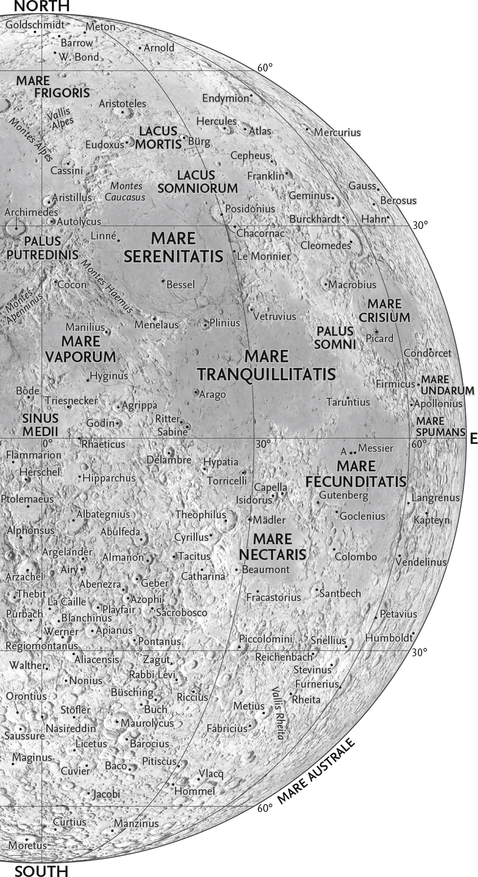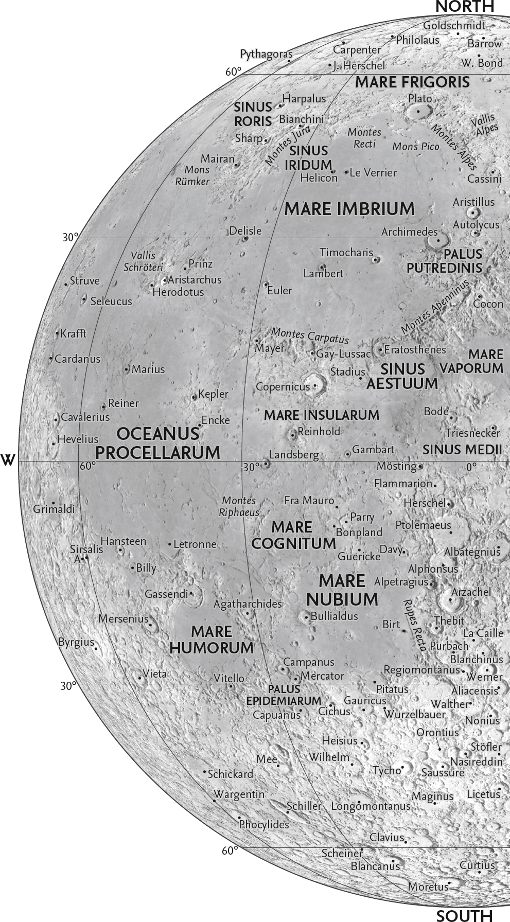 Abulfeda 6:20 Agrippa 7:21 Albategnius 7:21 Aliacensis 7:21 Alphonsus 8:22 Anaxagoras 9:23 Anaximenes 11:25 Archimedes 8:22 Aristarchus 11:25 Aristillus 7:21 Aristoteles 6:20 Arzachel 8:22 Atlas 4:18 Autolycus 7:21 Barrow 7:21 Billy 12:26 Birt 8:22 Blancanus 9:23 Bullialdus 9:23 Bürg 5:19 Campanus 10:24 Cassini 7:21 Catharina 6:20 Clavius 9:23 Cleomedes 3:17 Copernicus 9:23 Cyrillus 6:20 Delambre 6:20 Deslandres 8:22 Endymion 3:17 Eratosthenes 8:22 Eudoxus 6:20 Fra Mauro 9:23 Fracastorius 5:19 Franklin 4:18 Gassendi 11:25 Geminus 3:17 Goclenius 4:18 Grimaldi 13–14:27–28 Gutenberg 5:19 Hercules 5:19 Herodotus 11:25 Hipparchus 7:21 Hommel 5:19 Humboldt 3:15 Janssen 4:18 Julius Caesar 6:20 Kepler 10:24 Landsberg 10:24 Langrenus 3:17 Letronne 11:25 Linné 6 Longomontanus 9:23 Macrobius 4:18 Mädler 5:19 Maginus 8:22 Manilius 7:21 Mare Crisium 2–3:16–17 Maurolycus 6:20 Mercator 10:24 Metius 4:18 Meton 6:20 Mons Pico 8:22 Mons Piton 8:22 Mons Rümker 12:26 Montes Alpes 6–8:21 Montes Apenninus 8 Orontius 8:22 Pallas 8:22 Petavius 3:17 Philolaus 9:23 Piccolomini 5:19 Pitatus 8:22 Pitiscus 5:19 Plato 8:22 Plinius 6:20 Posidonius 5:19 Proclus 14:18 Ptolemaeus 8:22 Purbach 8:22 Pythagoras 12:26 Rabbi Levi 6:20 Reinhold 9:23 Rima Ariadaeus 6:20 Rupes Recta 8 Saussure 8:22 Scheiner 10:24 Schickard 12:26 Sinus Iridum 10:24 Snellius 3:17 Stöfler 7:21 Taruntius 4:18 Thebit 8:22 Theophilus 5:19 Timocharis 8:22 Triesnecker 6–7:21 Tycho 8:22 Vallis Alpes 7:21 Vallis Schröteri 11:25 Vlacq 5:19 Walther 7:21 Wargentin 12:27 Werner 7:21 Wilhelm 9:23 Zagut 6:20Map of the Moon