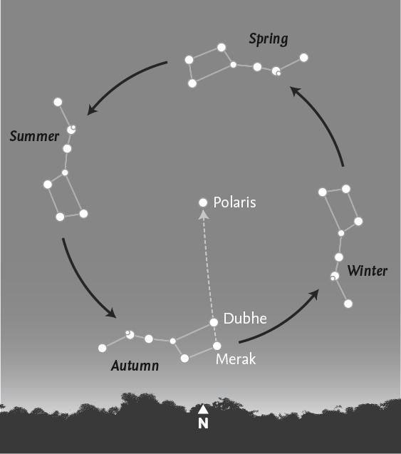 The key constellation when learning the pattern of stars in the northern sky is Ursa Major, in particular the seven stars forming the asterism, known to more-or-less everyone, as ‘the Plough’ or to people in North America, as the ‘Big Dipper’. As the chart shows, this is just circumpolar for anyone at latitude 40°N, except for Alkaid (η Ursae Majoris), the last star in the ‘tail’. Even so, the asterism of the Plough is low on the northern horizon between September and November, so it will be much easier to make out at other times of the year.