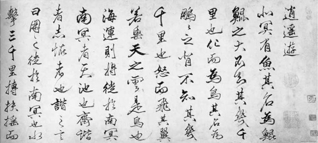 «Беззаботное скитание» – работа знаменитого минского каллиграфа Фэн Фана (фрагмент). Фэн Фан занимался гравировкой печатей в стиле чжуань, а также хорошо владел каллиграфическим стилем цаошу. Этот свиток он написал для своего друга в годы Цзяцзин (1521–1567). Иероглифы здесь естественные и изящные, строгие и отрешенные. Такую манеру в каллиграфии называют «мускулистым письмом» – штрихи энергичные, «костяк» важнее, чем «мясо» (под «костяком» в каллиграфии подразумевается композиция, расстояние между штрихами и иероглифами, размер иероглифов, наклон; под «мясом» – толщина и длина штрихов, их изгибы и изломы. – Примеч. пер.)