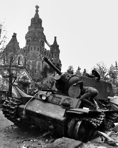 Немецкие солдаты осматривают подбитый советский танк. Петергоф. 1941 г.