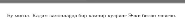 \end {document} Kompanovka qilib, ko‘rish buyrug’ini ishga tushirish bilan hujjatni ko‘rish maydonida quyidagini kuzatamiz: