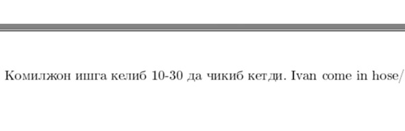 \documentclass {article} \usepackage [T2A] {fontenc} %% shrifni ko’chirissiz qo’shish\usepackage [russian] {babel} %% 3 Ingiliz matniga rus shriftini kiritish \begin {document} Комилжон ишга келиб 10—30 да чикиб кетди. Ivan come in hose/\end {document}