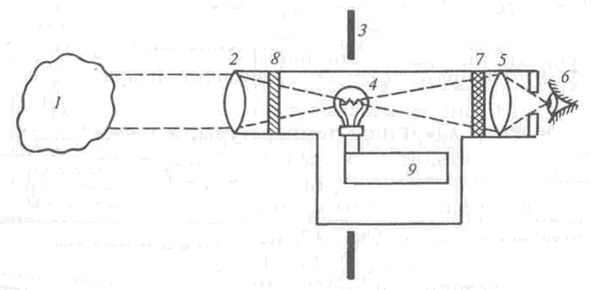 6.16 – rasm. Qizdirilgan simi yo‘qoluvchi optik pirometr. 1- obyekt, 2-obektiv, 3- fokuslash teksligi, 4- pirometrik lampa, 5- okulyar, 6-kuzatuvchi, 7- qizil yoruglik filtri, 8- yorug’likni yutuvchi oyna, 9- elektron blok