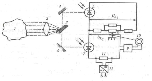 6.17 – rasm. Spektral pirometrni prinsipial sxemasi. 1- obyekt, 2- obyektiv, 3- filtr, 4,6- qaytaruvchi ko‘zgu, 5,7- fotoelementlar, 8- reaxord, 9- kuchaytirgich, 10- reversiv dvigatel, 11- qarshilik, 12- kuchlanish stablizatori