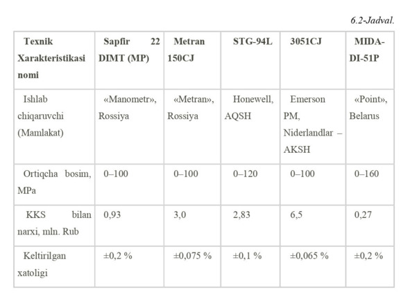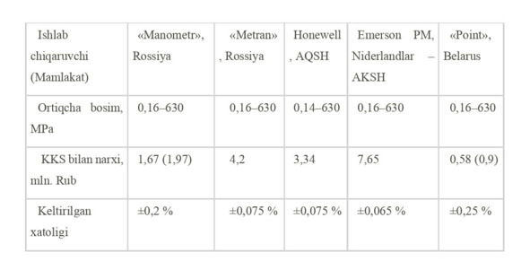 Dunyoda keng tarqalgan bosim – pasaygan bosim va bosim farqi o‘lchash datchikalarini texnik kattaliklar va narxlarini quyidagi jadvallardan taqqoslash mumkin: