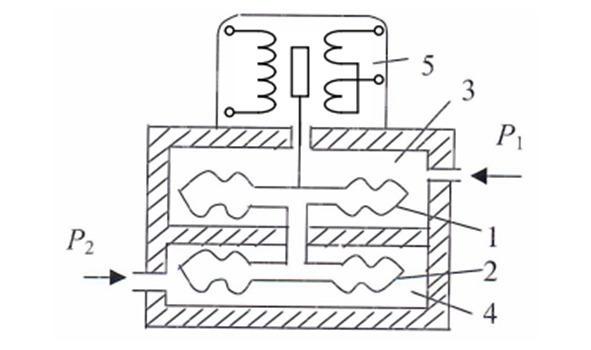 Diafragma differensial bosim ko‘rsatkichi DM (6.24-rasm) sezgir element sifatida ikkita membrana bo‘linmalarining 1 va 2 membrana blokiga ega. Bo‘linmalarning ichki bo‘shliqlari distirlangan suv bilan to‘ldirilgan va kanal orqali ulangan. Membrana qutilari alohida kameralarga joylashtirilgan P1 va P2 bosimlari bilan ta’minlangan 3 va 4, P1> P2…