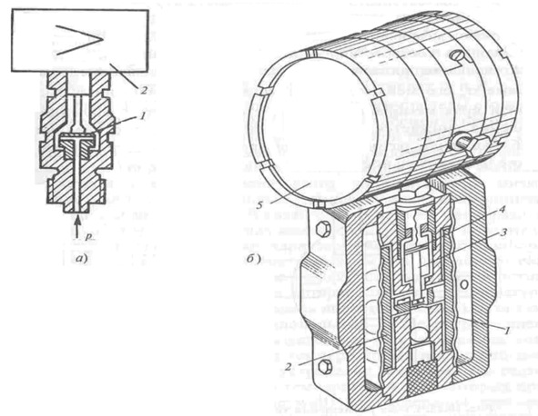 6.28 – rasm. «Sapfir-22» markasidagi bosim datchigi sxematik tuzilishi. a) 1- tenzoqarshilik, 2- elektron blok. b) 1,2- menbrana, 3- kuchni uzatuvchi richag, 4- tenzoqarshilik, 5- elektron blok.