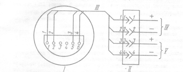 6.29 – rasm. 4-simli ulanish sxemasi. I- bosim datchigi elektron bloki klemmnigi, II- tashqi klemmnik, III- kabel, IV- doimiy tok manbai., V- chiqish signali.