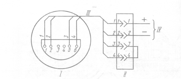 6.30- rasm. 2-simli ulanish sxemasi. I- bosim datchigi elektron bloki klemmnigi, II- tashqi klemmnik, III- kabel, IV- tok manbai va yuklama, chqish signali.