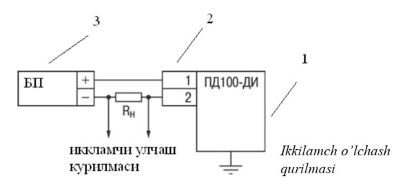 4-simli ulanishda bosim datchigiga tok manbai klemmnikni 1,2 nuqtalarga ulanib, chiqish signali klemmnikni 3,4 nuqtalardan tok kuchi ko‘rinishida olinadi. 2- simli ulanishda klemmnikni 3,4 chi nuqtalar o‘zaro tutashtirilib, tok manbai va yuklama, ya’ni ikkilamchi o‘lchash vositasi klemmnikni 1,2 nuqtalarga ulanadi. Bu turdagi bosim datchiklari o‘zlarini standart doimiy tok manbalari 22BP-36 bilan birga qo‘llaniladi. 22BP-36 doimiy tok manbai stabillashgan 36 V kuchlanishga ega bo‘lib, 1,2,4,6 kanalli bo‘ladi. 6- kanalli tok manbaiga bir vaqtni o‘zida 6 tagacha bosim datchigi ulanishi mumkin.